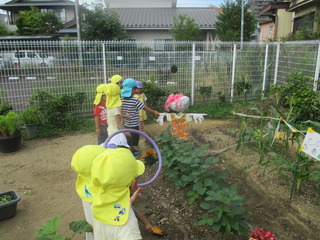そう思っていた矢先に、昨日、子どもたちが園庭にいない時に、畑の辺りをウロウロしているカラスを発見!また、野菜を食べられてしまうかも!どうしよう?!と思っている時に、にじ組の友だちからの提案が。