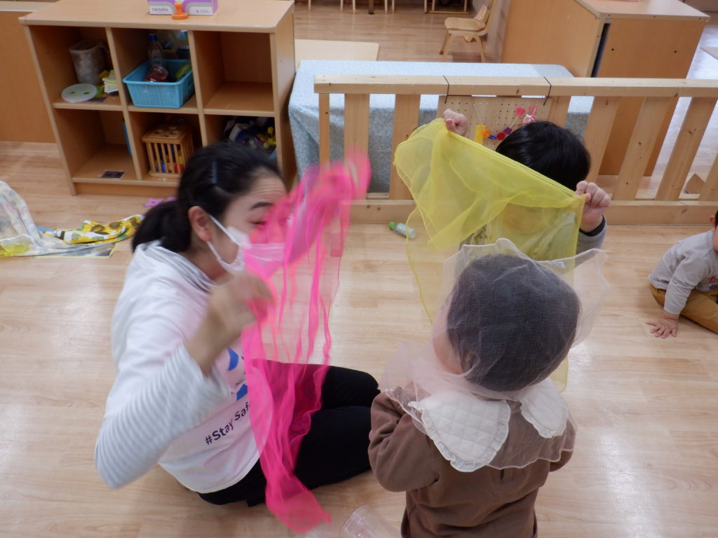 スカーフを使ってのわらべうた『じーじーばぁ』をしています。