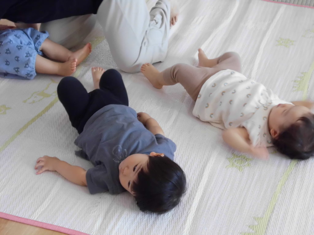 部屋でリズム遊びをしたり、もも組や大人の動きを見てきているので、音を聴いて自分から寝転がる子もいます。