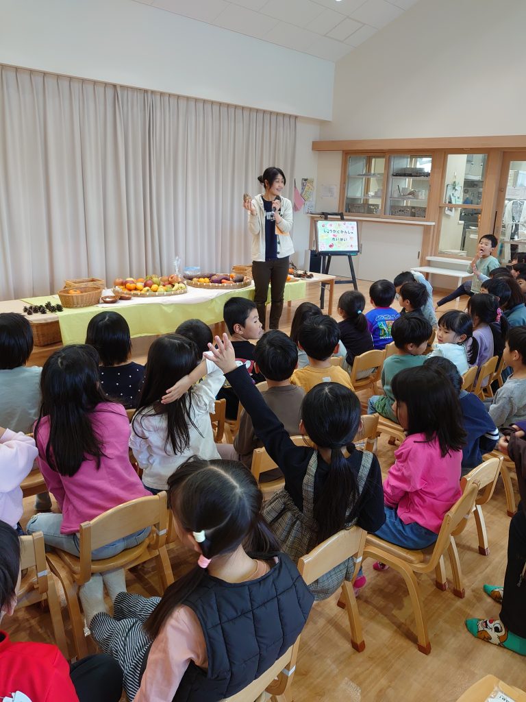 「果物や野菜が育つためには、何が必要かな?」と問いかけると、「おひさま」「雨」「種」「肥料」など、様々な答えが返ってきました✨