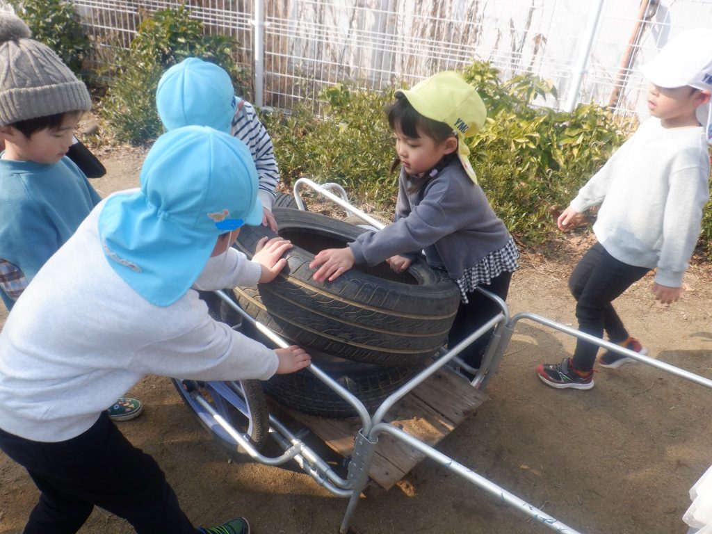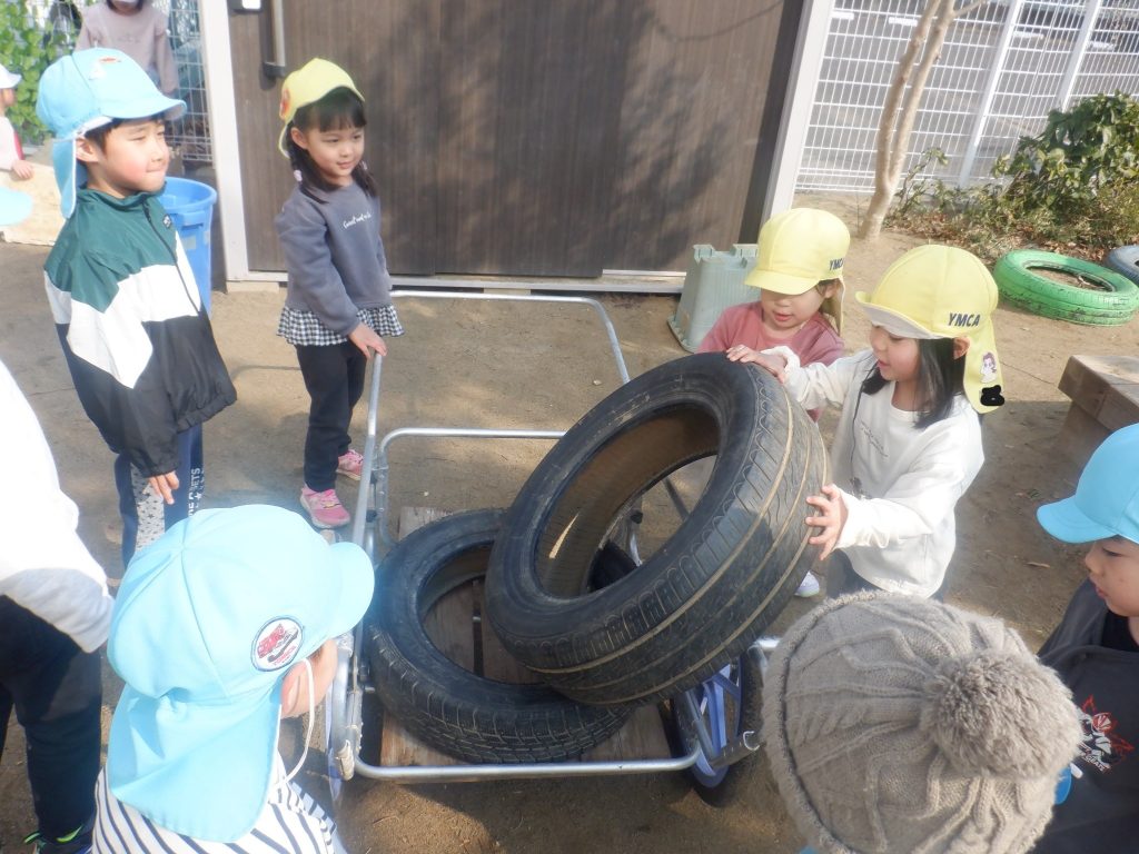 3歳児の子どもたちがタイヤを乗せますが、リアカーの枠にはまるように乗せられず・・・