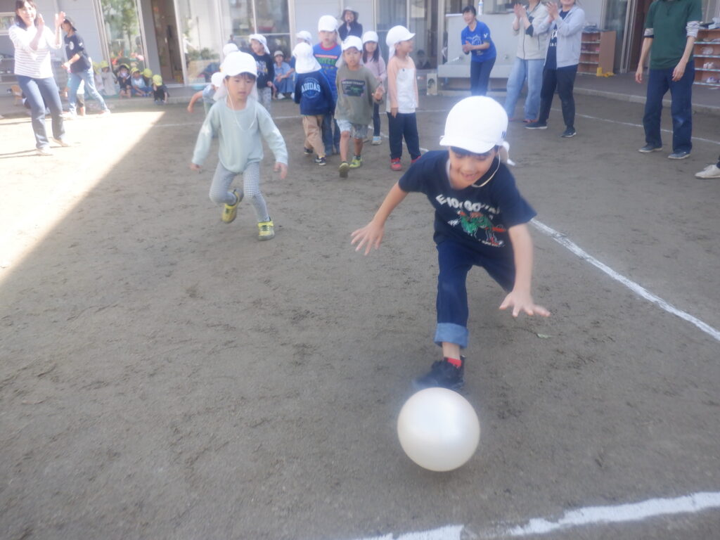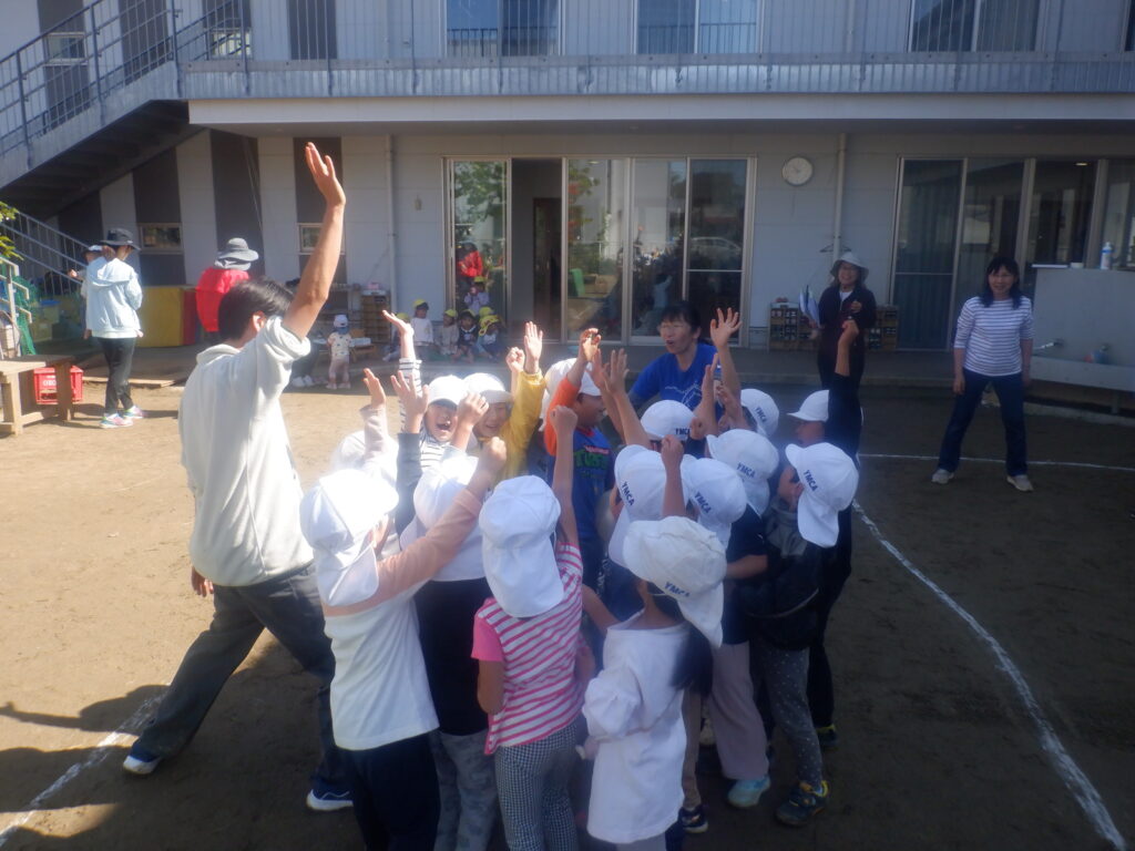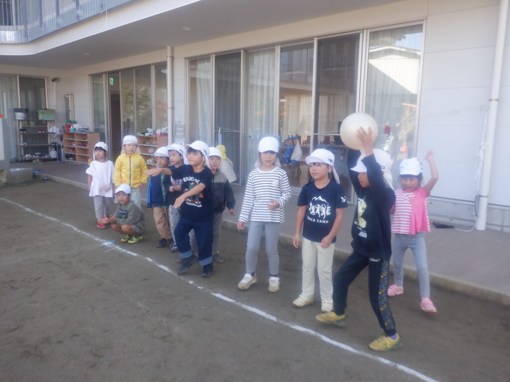 次はひかり組(5歳児)!ドッチボール対決のため円陣を組み団結力を高めています✨