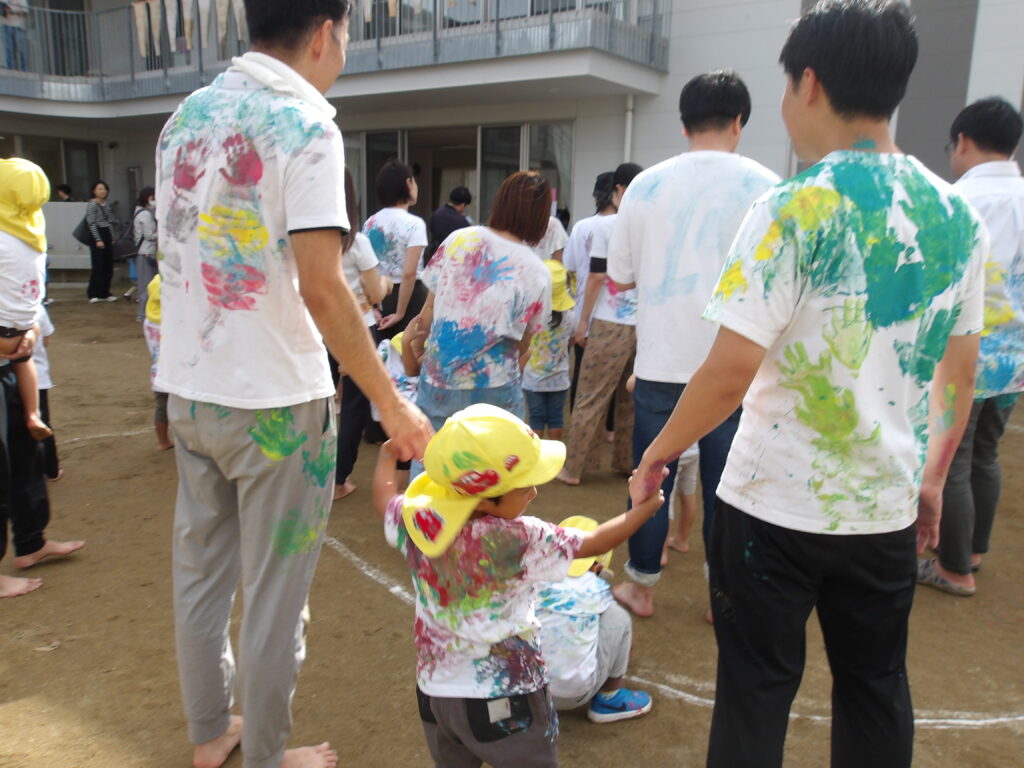 ほし組さんは、「びっくりカラフル大作戦」です。親子で絵の具遊びを行いました。赤、青、黄色、白の絵の具を準備していましたが、自由に親子で絵の具を塗りつけていく中で絵の具が混ざり、カラフルな服が出来上がっていました🌟