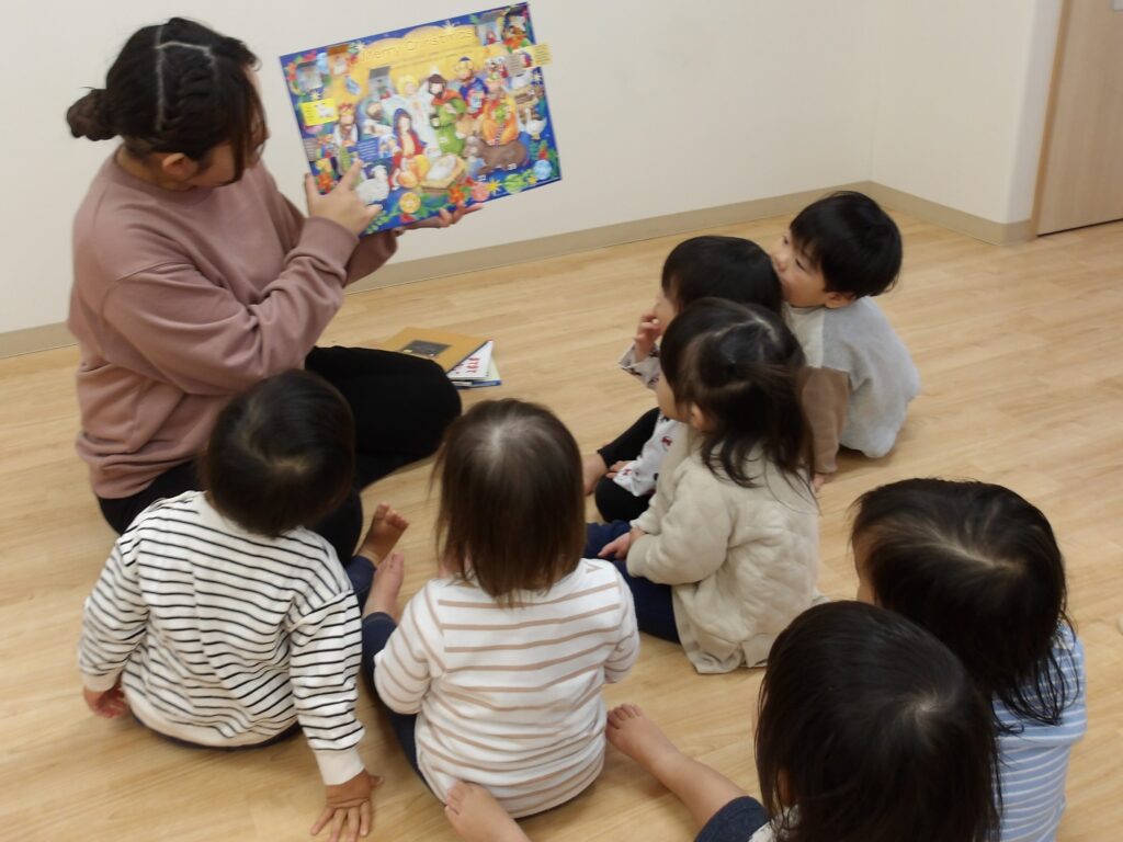 また、保育室でもクリスマスの讃美歌に親しんだり、くまのぬいぐるみを抱いて「赤ちゃんイエスさま」とページェントごっこを楽しんだり、クリスマスを心待ちにしている子どもたちです。