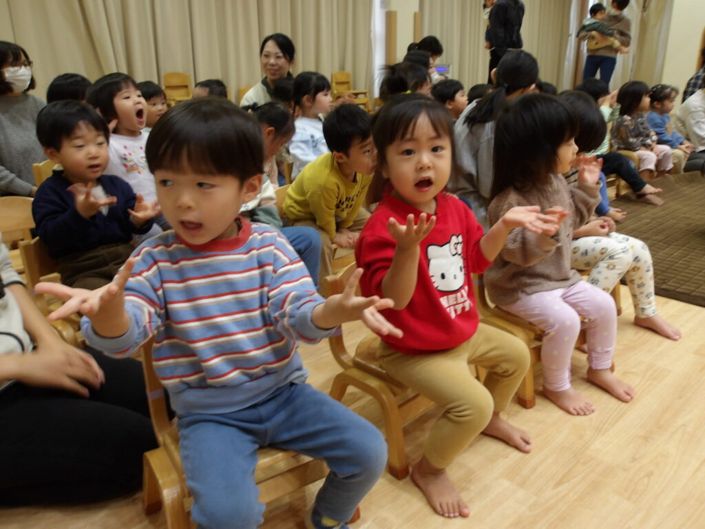 乳児部のアドベント礼拝では、繰り返し親しんでいる『おほしがひかる』の讃美歌を手振り付きで喜んで歌う姿がありました。