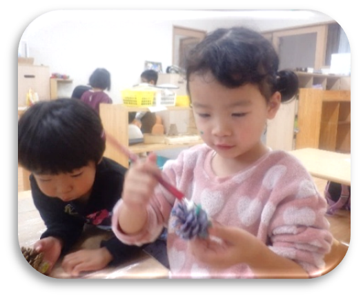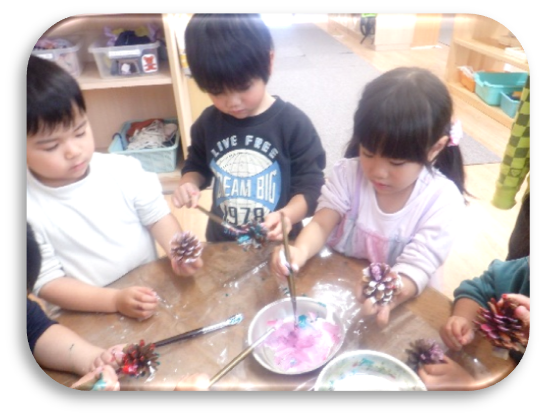 ほし組(3歳児)さんは、普段から楽しんでいる絵の具を使った「松ぼっくりのツリー」と「クリスマスカード」を制作しました。「大きさはこのくらいにしよう!」「こっちの黒もいいなあ~」と、松ぼっくりの大きさや色をじっくり選んでいる子どもたちでした。
