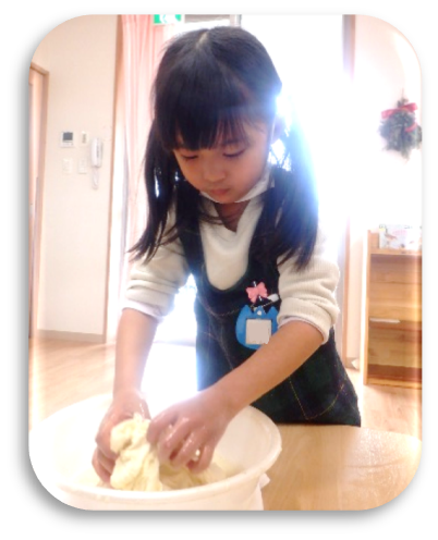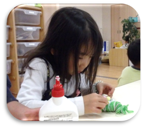 にじ組(4歳児)さんとひかり組(5歳児)さんは、毛糸のクリスマスツリー、布染めのリース、和紙のゆきだるまの中から、1つ選んで制作をしました。「この色はママが好きそう」「ゆっくり作った方が、きれいにできるよね」と、お家の人のことを想像したり、難しいところも諦めずに丁寧に作ろうとする気持ちが見られました。