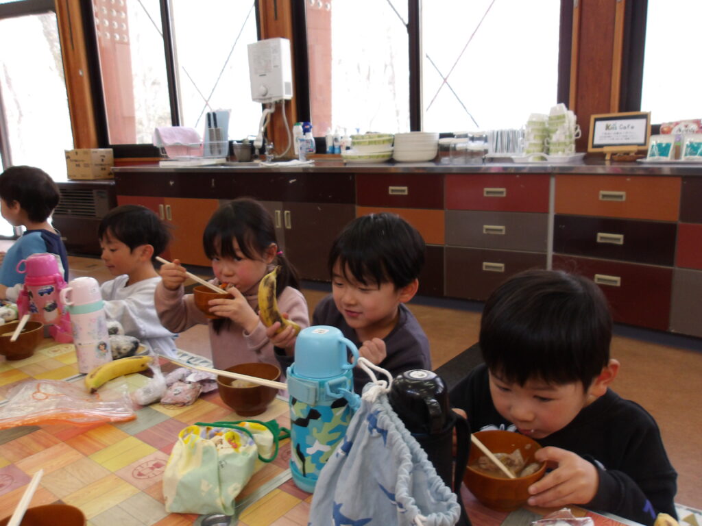 雪やつららなど冬の自然に触れ、たくさん体を動かした後は、お家の方に作って頂いたおにぎりとマトカ特製の豚汁をおいしくいただき、大満足の子どもたちでした。