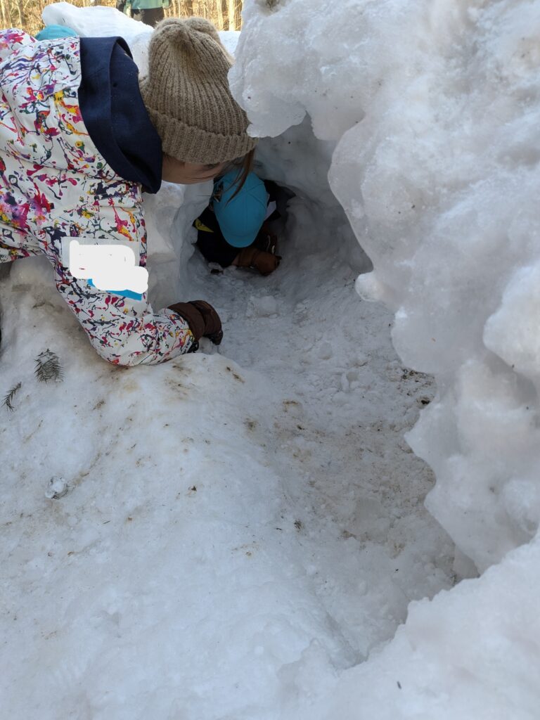 裏庭にはたくさん雪が残っており、雪のトンネルをくぐったり、友だちと雪玉を作り、どれくらいの高さまで投げられるかというゲームをしたり、力を合わせて大きな雪だるまを作ったり、楽しんでいました。