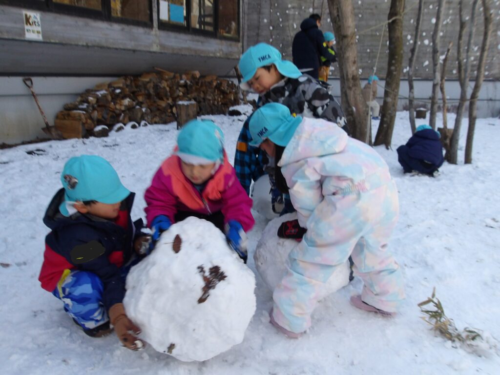 裏庭にはたくさん雪が残っており、雪のトンネルをくぐったり、友だちと雪玉を作り、どれくらいの高さまで投げられるかというゲームをしたり、力を合わせて大きな雪だるまを作ったり、楽しんでいました。
