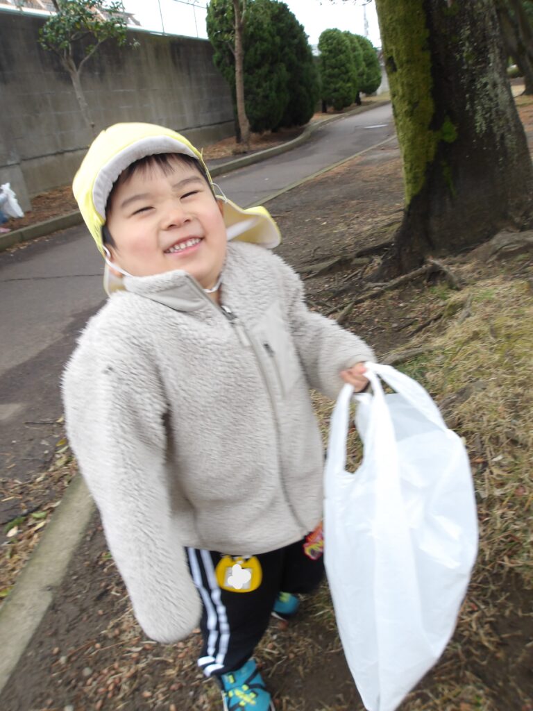 袋いっぱいに集めて、「見てみて~!こんなに拾ったよ!」と話す表情は、とてもいきいきとしています。