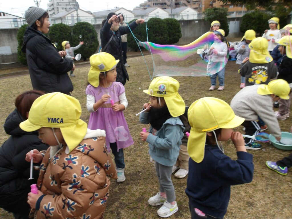 夏に楽しんできたしゃぼん玉も、広い場所でたっぷりと。