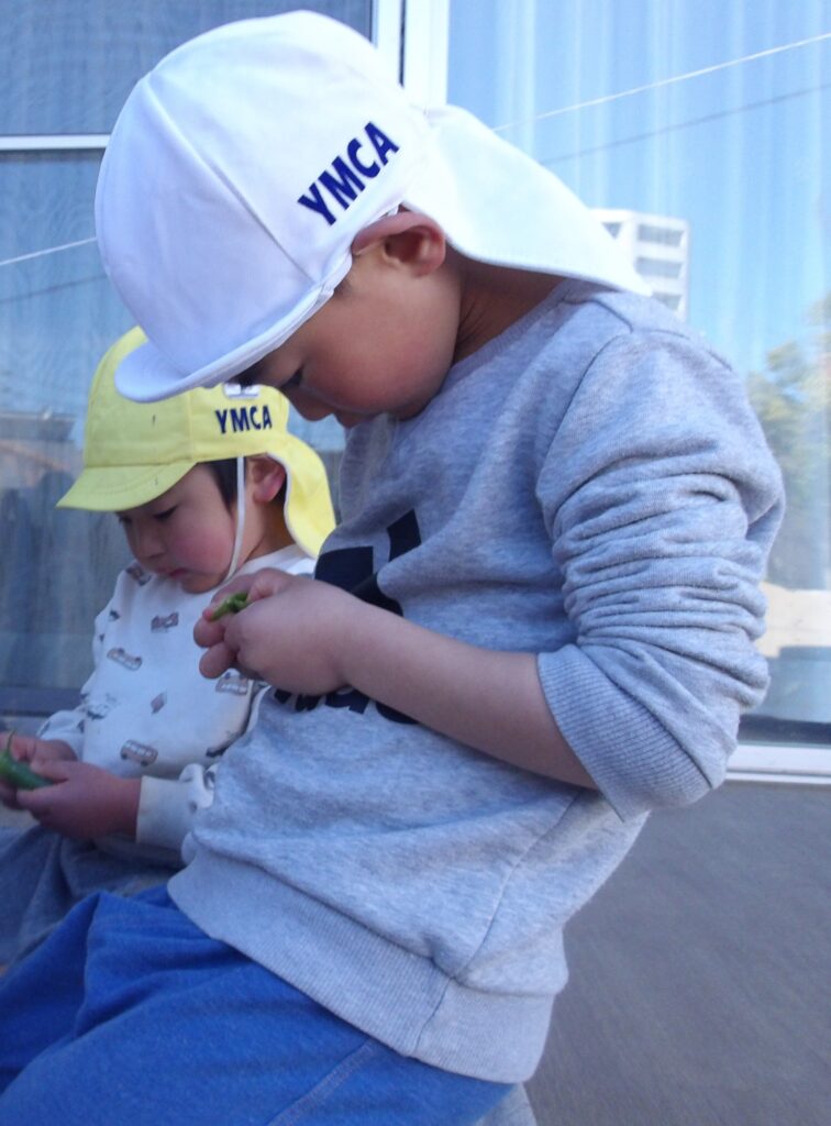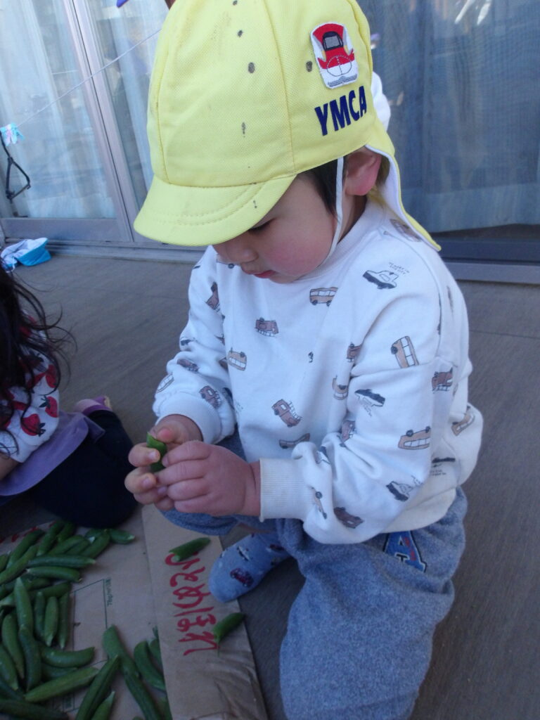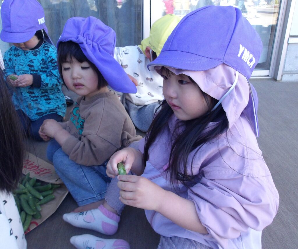 グリンピースのさやは意外と硬く、なかなか割ることができないほし組(3歳児)のお友だちの、お手伝いをひかり組(5歳児)のお姉さんがたくさんしてくれました。